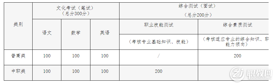 文化考试试题由省统一命制,分普高类、中职类,语文、数学、英语三科同堂分卷,每科满分100分,总分300分;职业技能综合测试满分200分。
