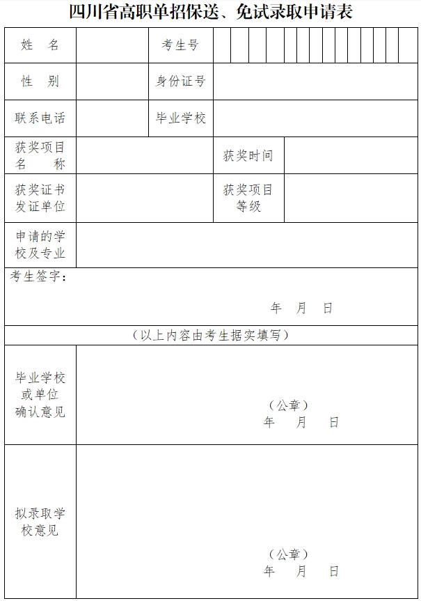 所有符合保送、免试录取条件的考生和体育比赛获奖考生应参加高职单招报名,并在2024年1月22日12:00前向学校提交《四川省2024年普通高等学校高职单招保送、免试录取申请表》。