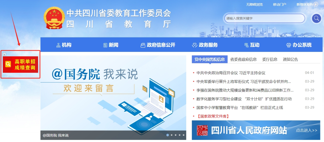 1、搜索四川省教育厅官方网站:http://edu.sc.gov.cn,进入主页面,点击进入“高职单招成绩查询”界面